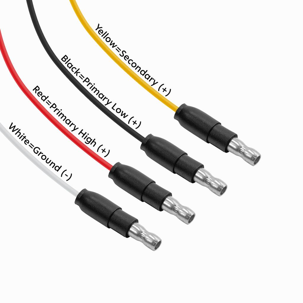 - Código de colores del cableado: Blanco = tierra (-), negro = primario bajo (+), rojo = primario alto (+), amarillo = secundario (+).