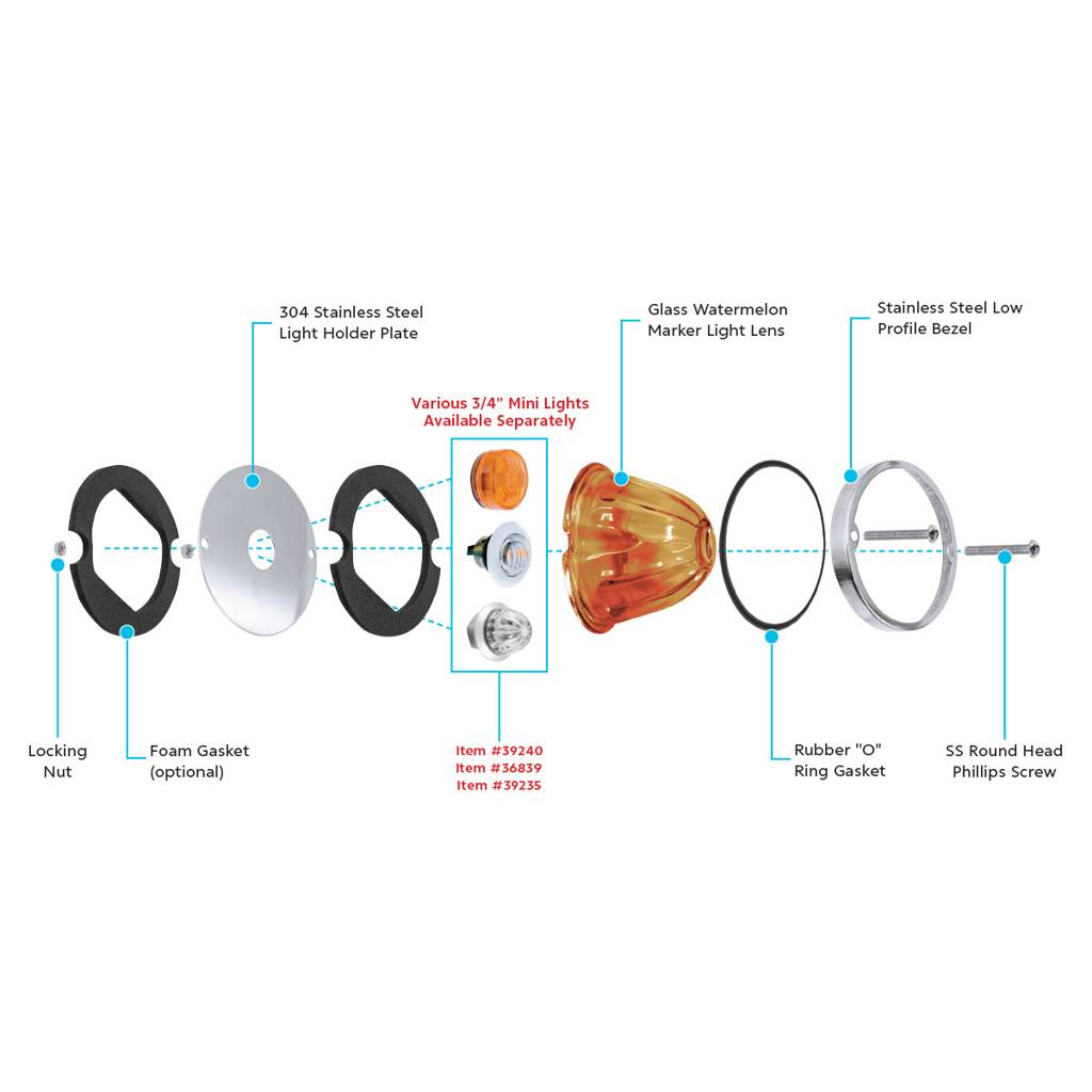 - Bisel de acero inoxidable de perfil bajo, tornillos y tuercas de montaje y juntas incluidas.