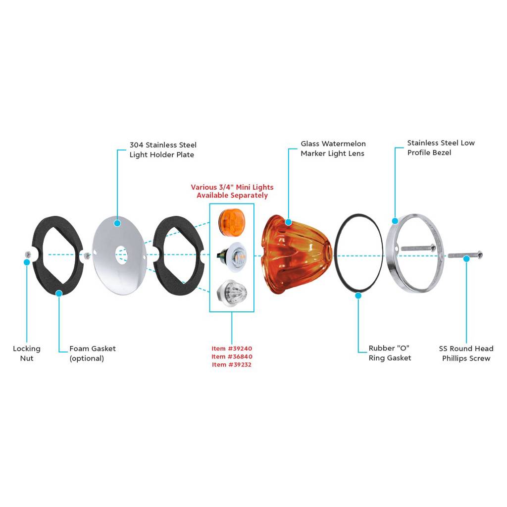 - Bisel de acero inoxidable de perfil bajo, tornillos y tuercas de montaje y juntas incluidas.